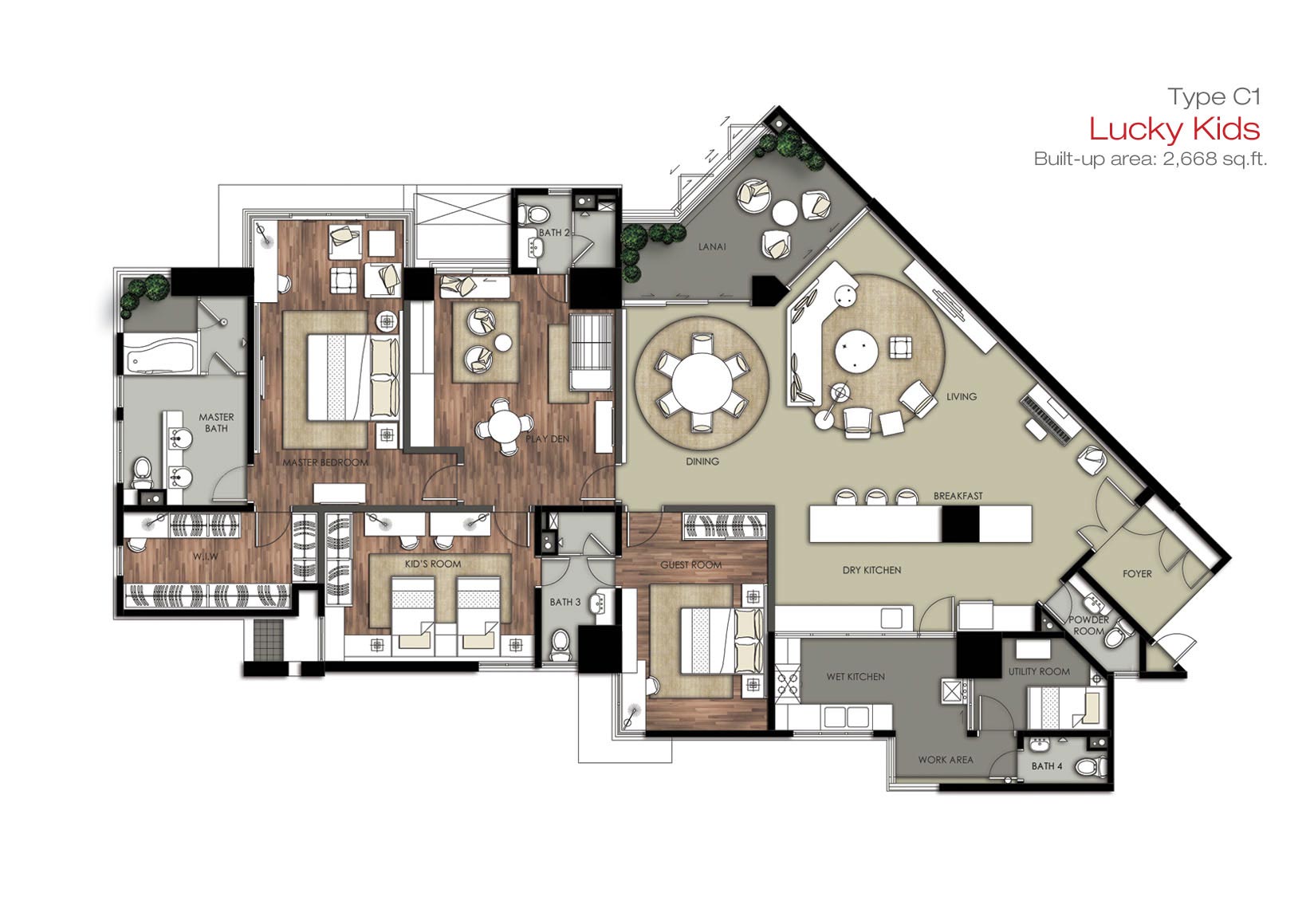 This design is ideal for couples who are starting a new life together. 'The Newly Weds' includes designated areas for a gym and study. There is also a guest room for family and friends. Once the family expands, the walls can be removed and rooms can be converted to accommodate new additions.