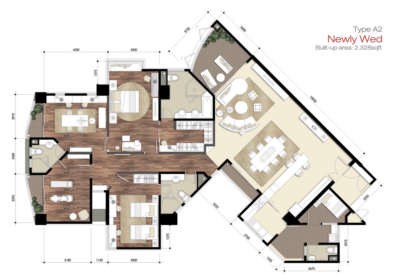 This design is ideal for couples who are starting a new life together. 'The Newly Weds' includes designated areas for a gym and study. There is also a guest room for family and friends. Once the family expands, the walls can be removed and rooms can be converted to accommodate new additions.